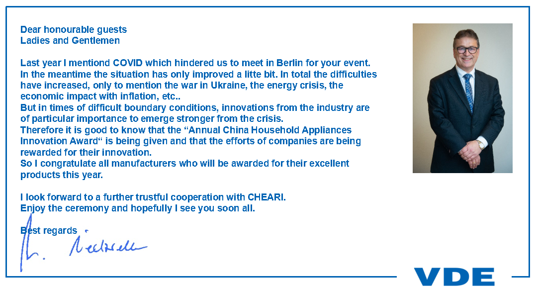 VDE常务董事兼IECEE主席Wolfgang Niedziella也通过视频祝贺大会召开。Wolfgang Niedziella表示,身处困难重重的大环境中,创新对于行业持续发展壮大尤为重要。此时, “中国家用电器创新成果”发布盛典如期举行,让企业的努力创新得到回报,对行业发展有十分正向的引导作用。