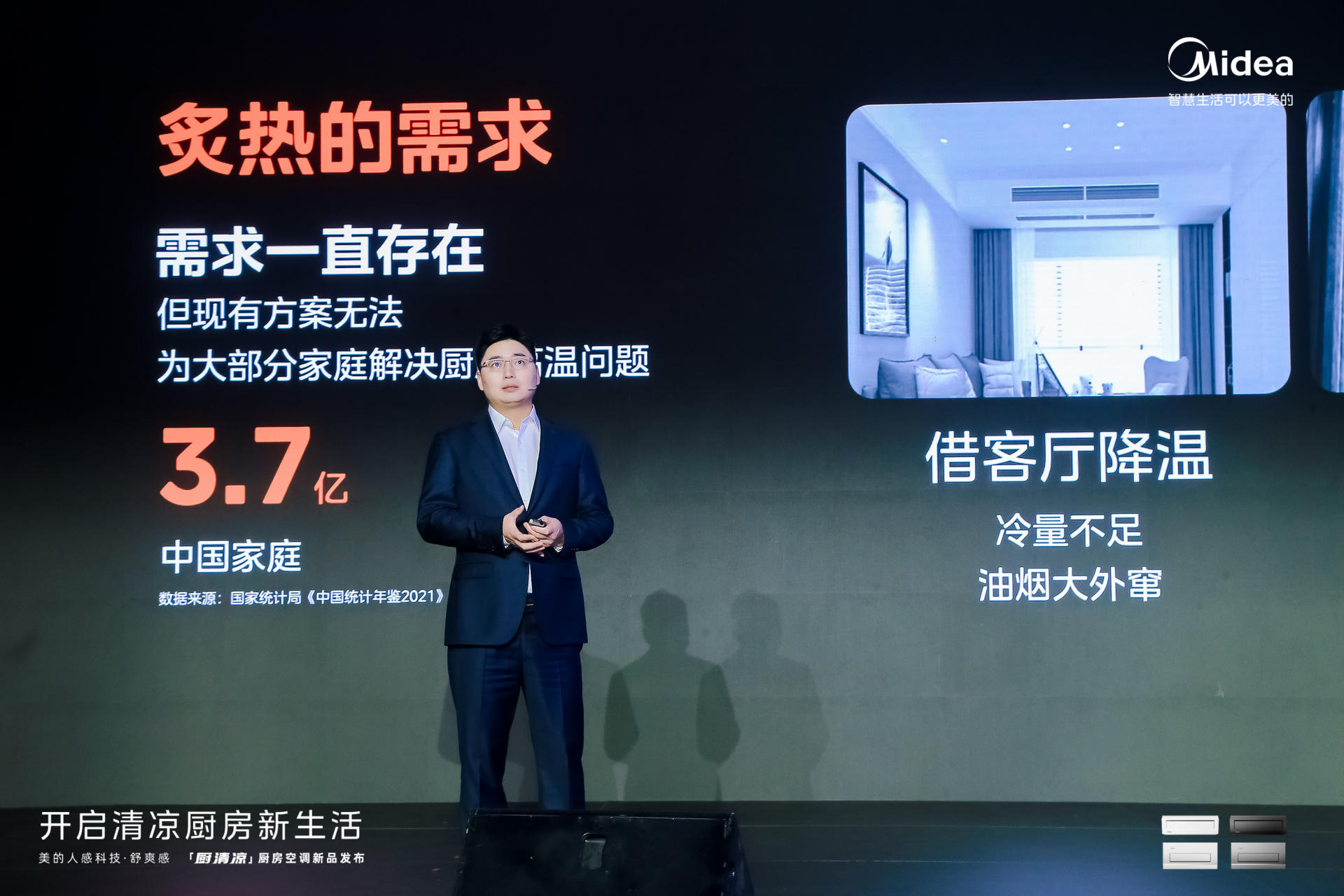 美的家用空调事业部国内营销公司总经理张玉龙表示,随着居住条件的改善和健康意识的提升,改善厨房内的高温问题已是迫在眉睫。在居家生活中,客厅、卧室、书房等空间,都有针对性的空调产品。然而厨房作为居家生活不可缺少的场景,现有方案却无法为大部分家庭解决厨房高温问题。市场调研数据表明,中国家庭有3.7亿户,厨房内空调的普及率却不足1%,普及率与用户需求明显不匹配。