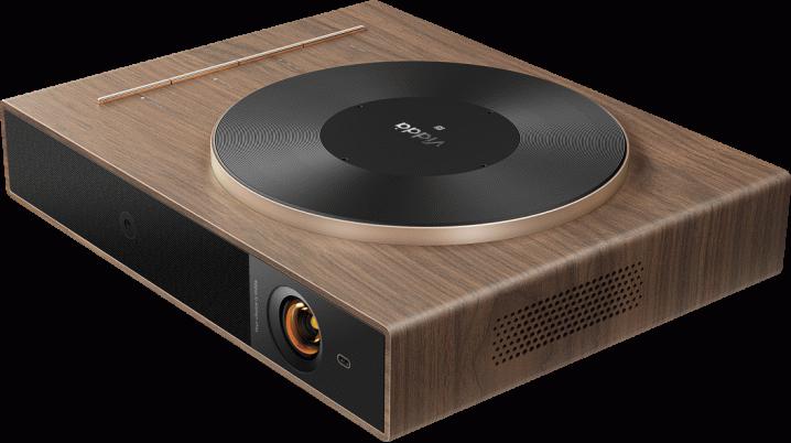 悦己M1则采用了全新的设计语言,薄薄的机身,不到一张A4纸的大小;整体就像一本大书,可以轻松放进普通的背包中,方便随时随地投出高清大屏。特别的是,悦己M1的顶部是一个仿黑胶唱片的设计,这让它更像是一台复古的木制唱机,别致的造型让人爱不释手。