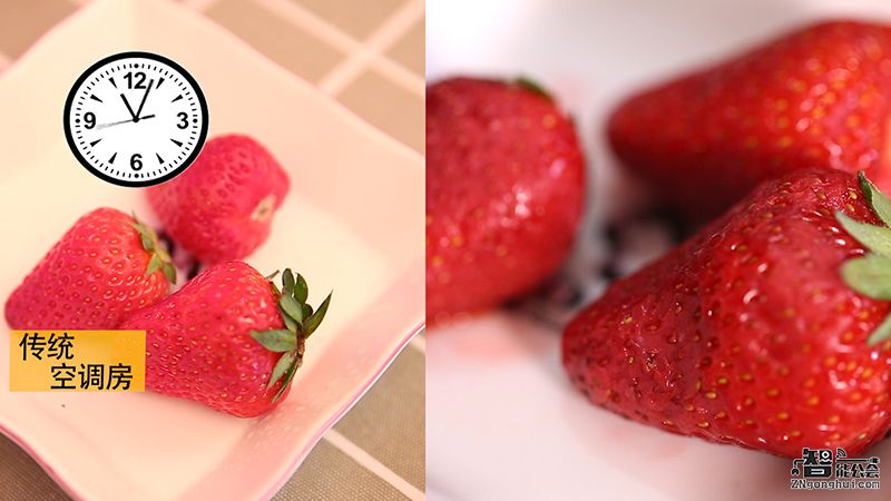 时间过去一小时,传统空调房里的草莓失去了当初的斗志,缩在一起,而温湿双控空调房里的草莓却依旧斗志昂扬。