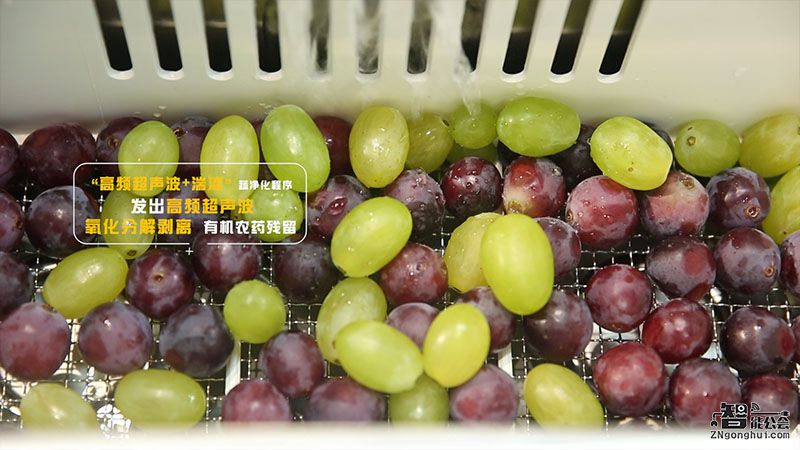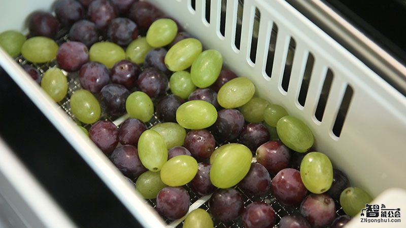 位于左侧的独立果蔬槽采用了半透明的简约盖板,收放自如,人性化把手的设计也方便用户拿取。既然是果蔬净化槽,我们不妨就来做个小测试,看它是不是真的名副其实。葡萄这类果实密集的水果相对来说比较难清洗,此次我们就来通过Q7实际洗一下。为了方便大家看到净化槽的运行过程,我们把上盖打开,可以看到在果蔬槽运行的时候,葡萄周边产生了很多的小气泡,用手指可以感受到麻麻的感觉,这是由于它搭载“高频超声+湍流”双效果蔬净化程序,发出的高频超声波在浸泡果蔬的水下形成数以万计的小空泡,同时空化泡爆裂时产生瞬间的能量会把部分水分子分解为自由基和羟基,自由基对有机农药残留会起到氧化分解作用,能够轻松剥离蔬果上的农残。