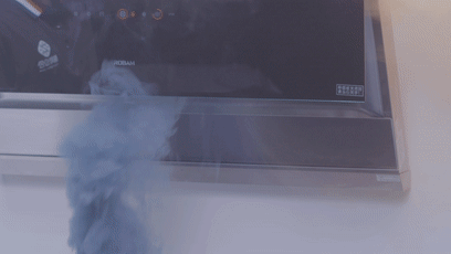 我们只需将手掌对准油烟机的按钮位置,即手掌悬停,老板油烟机5700就能瞬间形成超大吸力,直接从2档变成6档的吸力,将蓝色的和旁边普通油烟机下面的橙色烟雾一并吸入,以压倒性的优势完胜了旁边的普通油烟机,老板油烟机5700大吸力 “巨幕拢吸” 截杀油烟不是大话,而是实实在在的功效,有图有真相!小伙伴们可以仔细看看上面的视频,相信一定会震撼到你的!