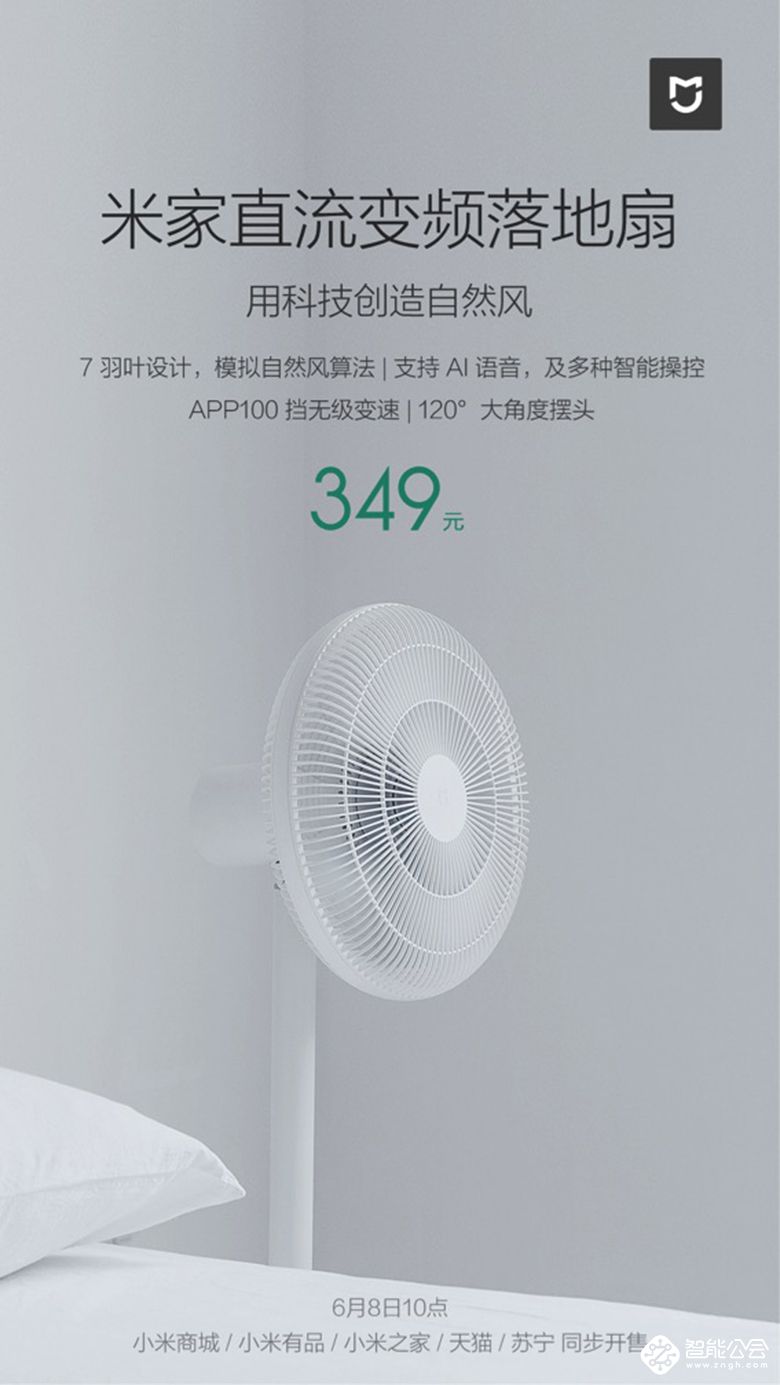 米家直流变频落地扇在具备智能功能和精致细节设计的同时,也提供了低至349元的亲民售价。相比于市售直流风扇来说,它拥有独创的模拟自然风的算法、小米AI音箱语音控制、APP可100档无级变速等优势,非常有竞争力,具备显著的夏季爆品属性。感兴趣的用户可以在6月8日到小米商城、小米之家、小米有品、天猫、苏宁购买。
