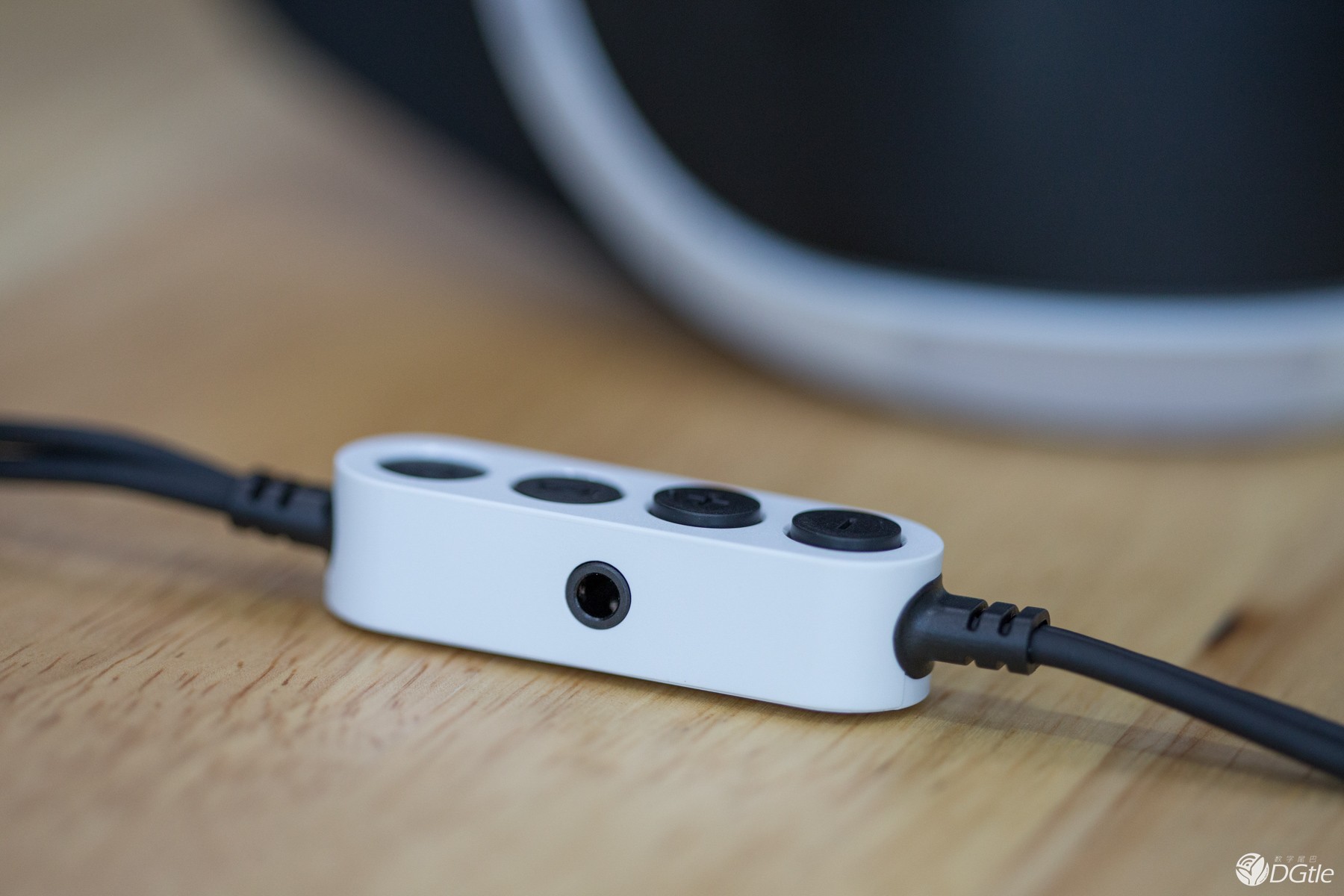 与头显连接的线缆上有一个线控装置,可以开启/关闭 PlayStation VR 电源、调整音量和连接耳机。随机附带了一个黑色配色的入耳式耳机,音质效果算不上非常优异,不过 3.5mm 耳机接口胜在适用范围广,因此可以随意接自己平常使用的耳机。