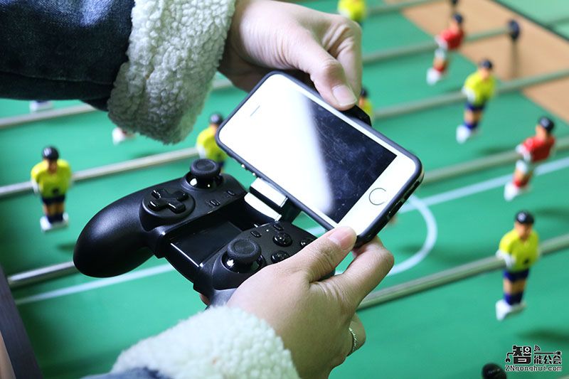 打开手柄中间的伸缩支架,就可以手机或者其他智能设备夹在此处,不过笔者尝试用它来加8寸平板,发现支架的伸缩性还是有限制的,当然,把iphone6p放在这里还是没有问题的。值得一提的是这个支架的上下两端还有柔软的防滑垫,这样一方面能够保护手机不会被摩擦,另一方面还有效的起到了稳定手机的作用,在玩游戏的时候,即使有较大的动作幅度也不会担心把手机掉下来,真的是蛮实用!