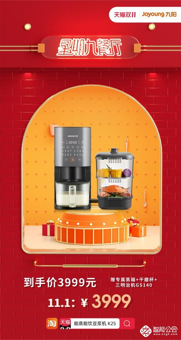 11月1日,九阳携手天猫共同打造的双11“星期九餐厅”正式开启啦!九阳不用手洗破壁机、不用手洗豆浆机和多功能蒸汽饭煲等一众原创小家电,带来超多惊喜折扣,快来抢购吧!