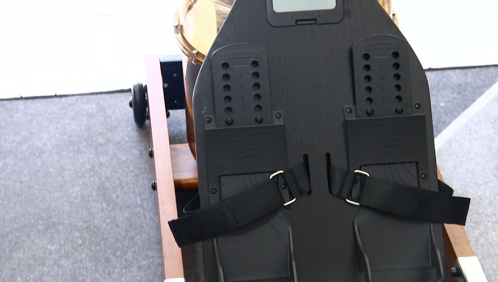 划船机可以调动全身80%以上的肌肉,但有两个部分是固定不动的,其中之一是脚。在“划船”时需要借助胳膊的拉力和腿部的蹬力来完成一系列动作,这时,脚是一直固定的。金史密斯智能水阻划船机固定脚的地方有一对黑色脚踏,可以根据不同高度、鞋码调整尺寸。