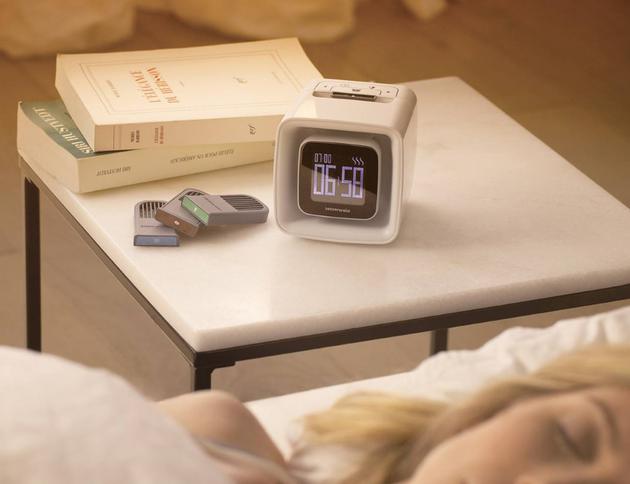 Sensorwake造型有些像复古电视,除了支持光线、声音提醒,还可以自动释放香气。