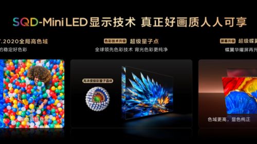 TCL SQD-Mini LED是Mini LED技术的重磅升级。 基于超级蝶翼华曜屏与超级量子点两大核心技术,它实现了100% BT.2020全局高色域,在亮...